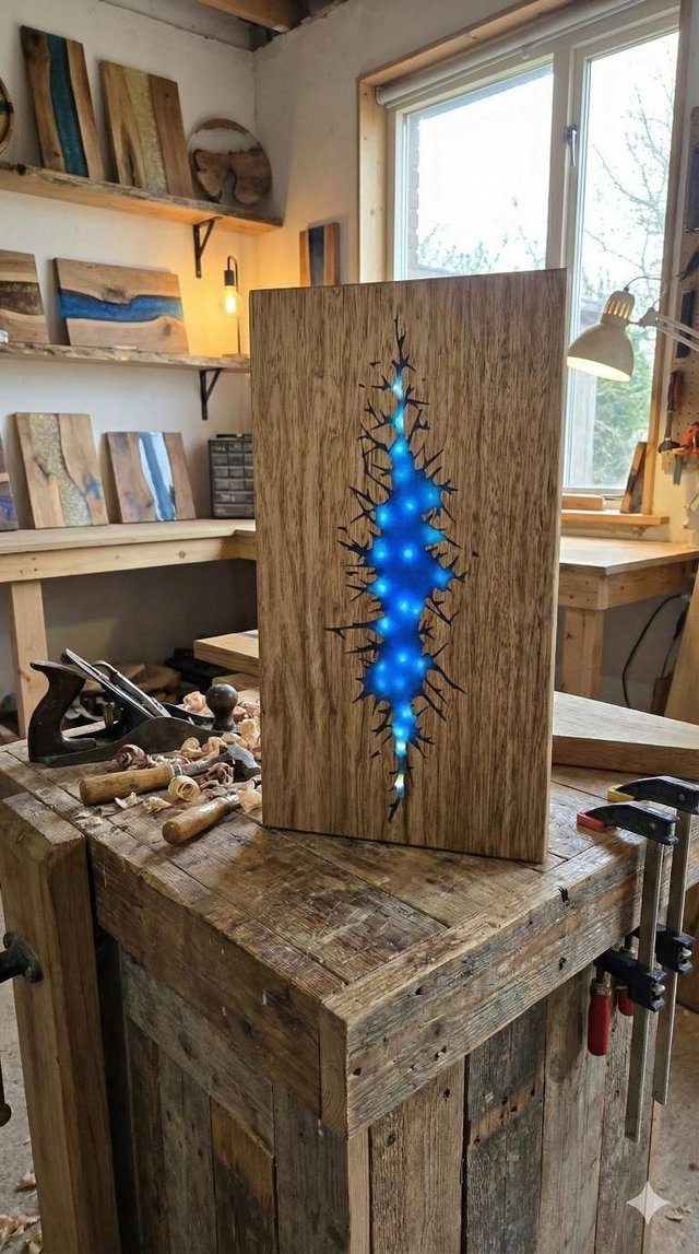 Sa particularité réside dans ses incrustations en résine époxy qui, une fois activées, révèlent une profondeur fascinante. Grâce à un système de LED intégrées, la résine s'illumine pour créer un effet visuel saisissant, parfait pour sublimer vos tables ou décorer votre intérieur.